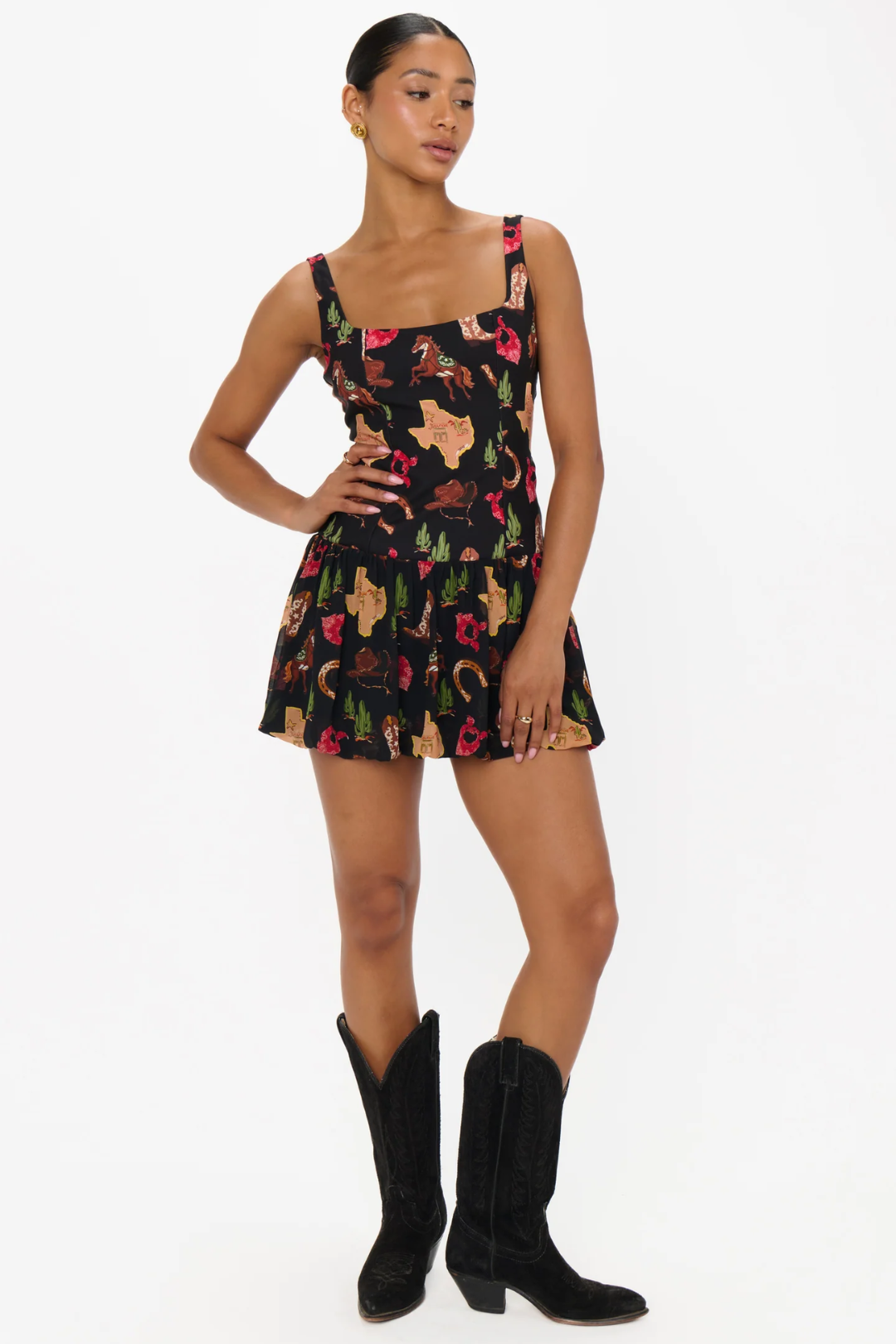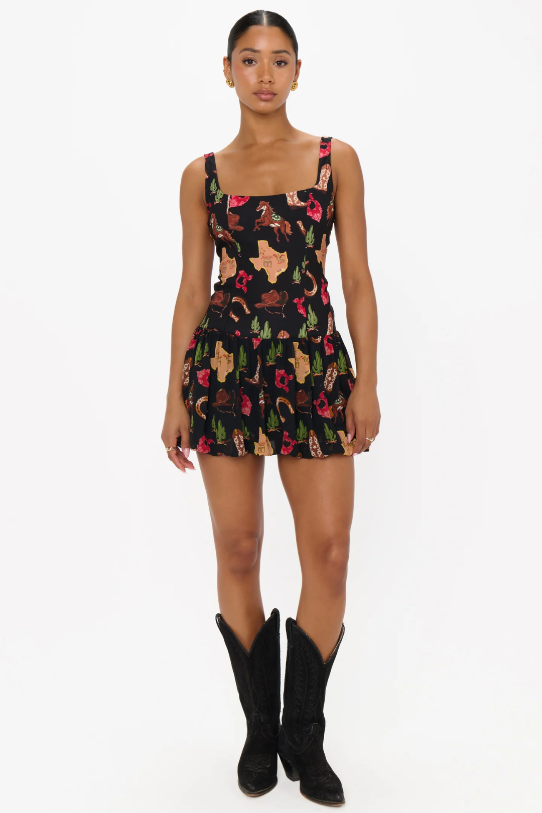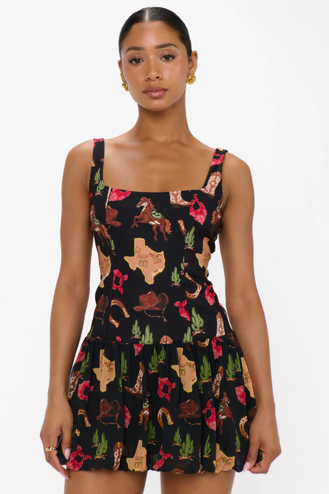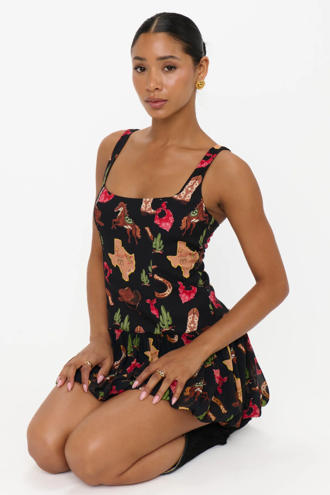 Not here to blend in. The Marlo Mini Dress is made for bold entrances and unapologetic style. With a square neckline, adjustable straps for a flawless fit, and a bubble skirt brings playful volume. The western-inspired print adds just the right edge, mixing southern charm with serious attitude. Perfect for owning the spotlight at parties, rodeo-core pics, or leveling up your festival game.