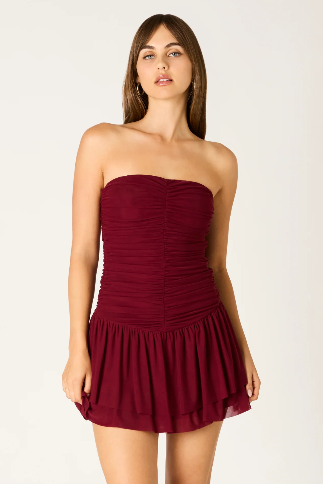 Meet the dress that knows how to make an entrance. The Astrid Dress is a flirty mini moment with a sculpted, strapless bodice that flatters your shape. Featuring a straight neckline keeps the look sleek, while the subtle ruching, structured fit, and flared tiered hem add that touch of drama you want for nights out. Perfect for girls' nights out, birthdays, club nights, and rooftop dates.
