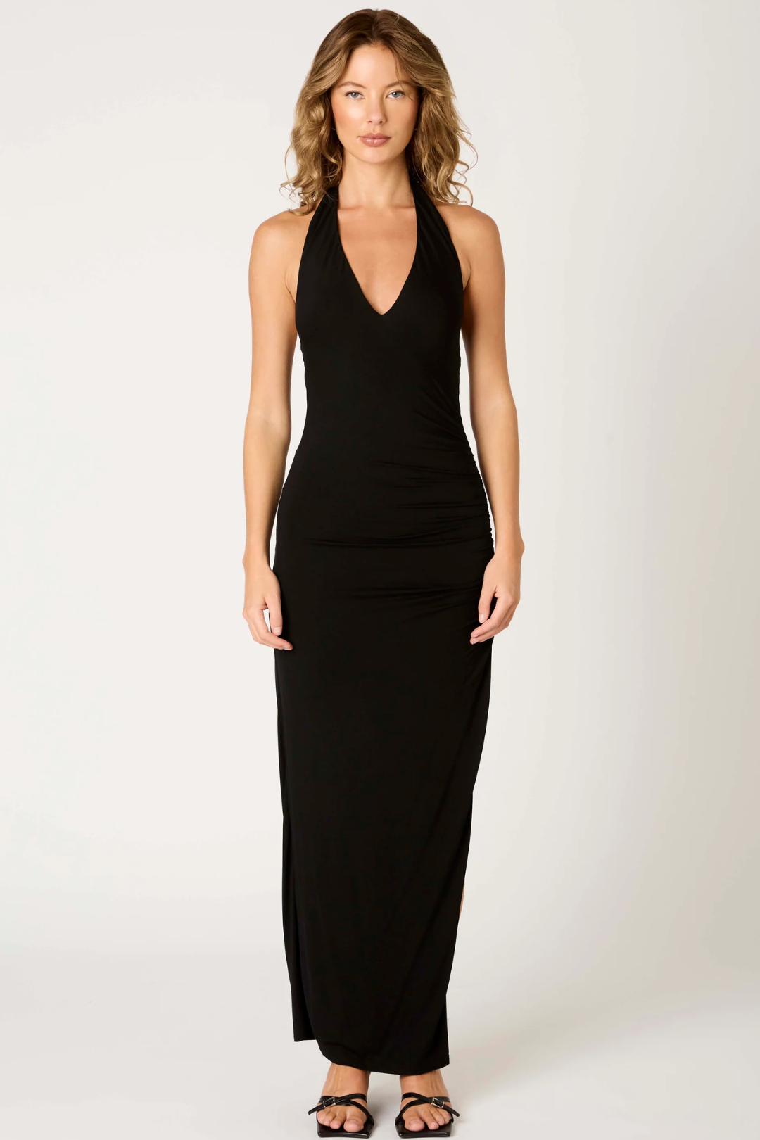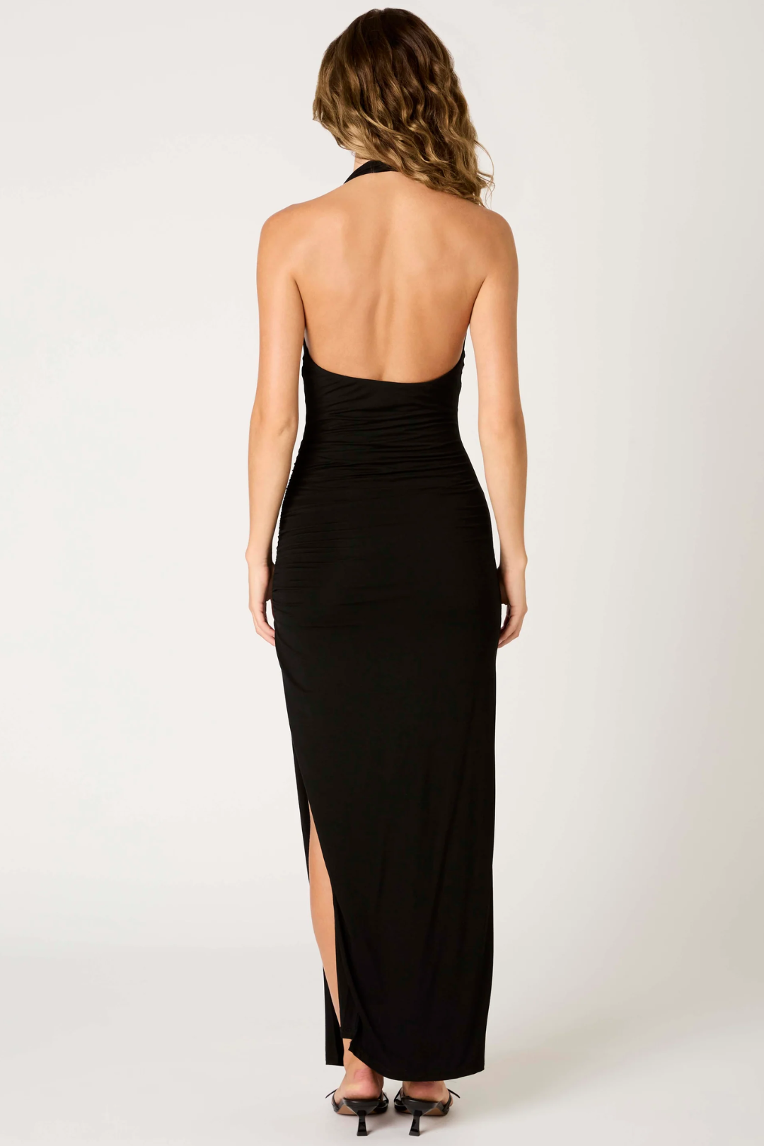 Effortlessly elevated. NIA's Doris Dress is a go-to for nights that call for just the right amount of drama. Crafted from body-hugging, ultra-soft jersey knit fabric, featuring a plunging V-neckline, side ruching detail, a sleek high side slit, and an open back. Perfect for cocktail hours, special events, or when you want to serve main character energy.