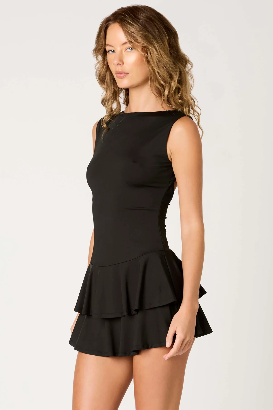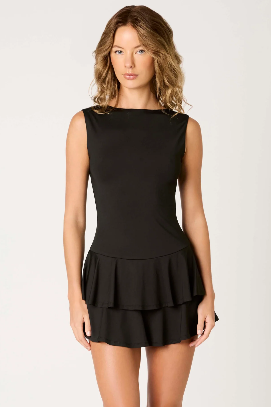 Soft structure meets flirty movement in the Nari Dress from NIA. Designed with a flattering clean scoop neckline and wide sculpted straps, this silhouette is both supportive and effortlessly feminine. A deep scoop back adds just the right hint of drama, while the tiered double ruffle skirt brings playful volume with every step.