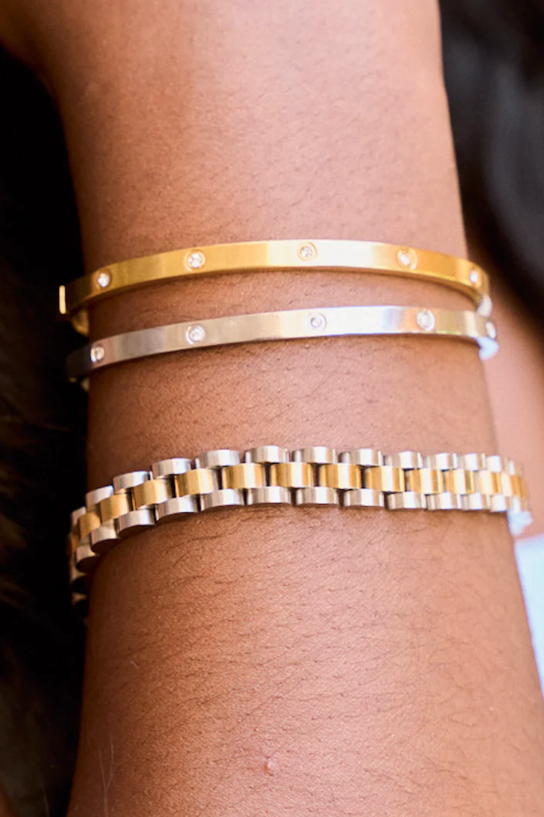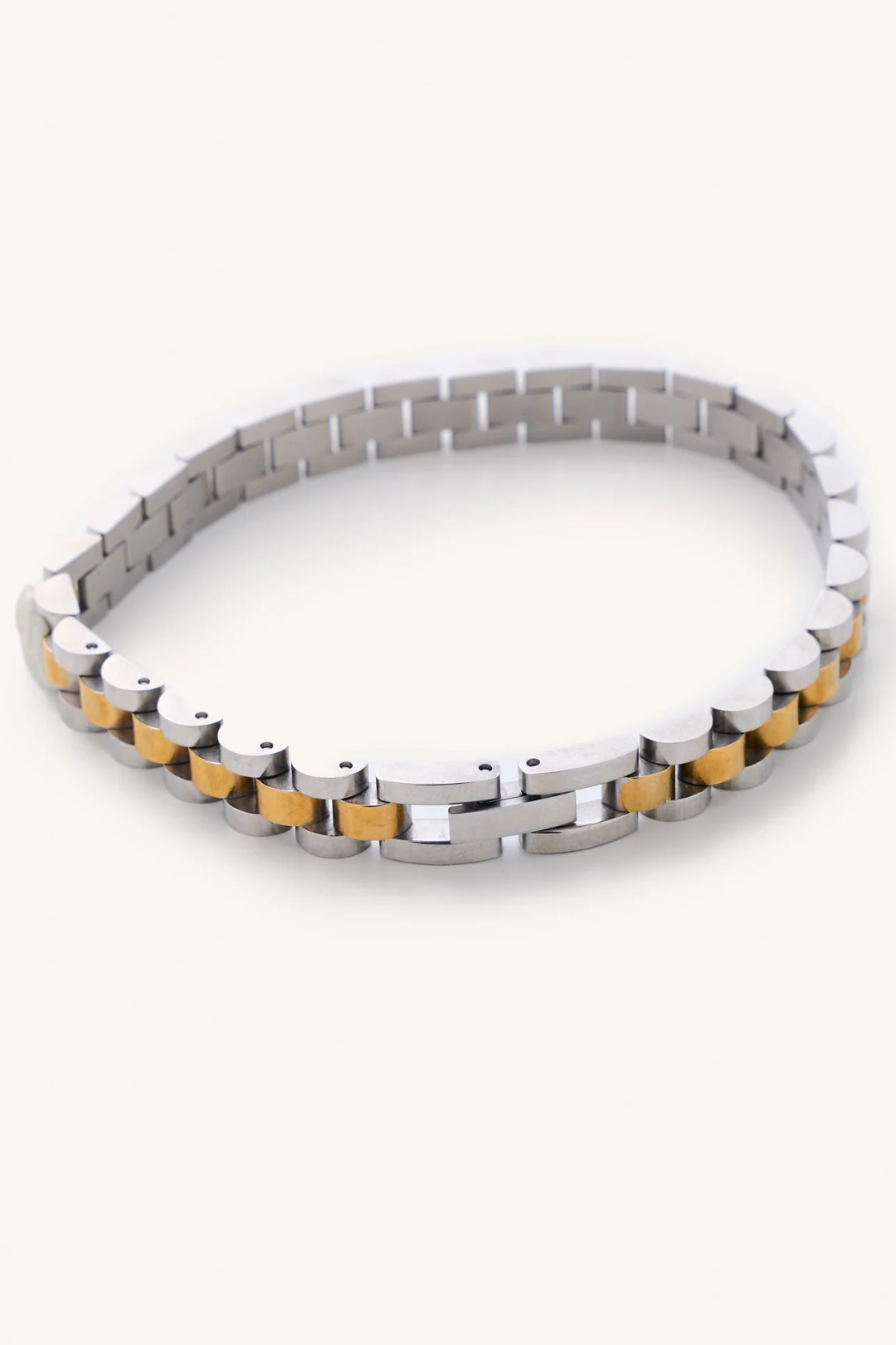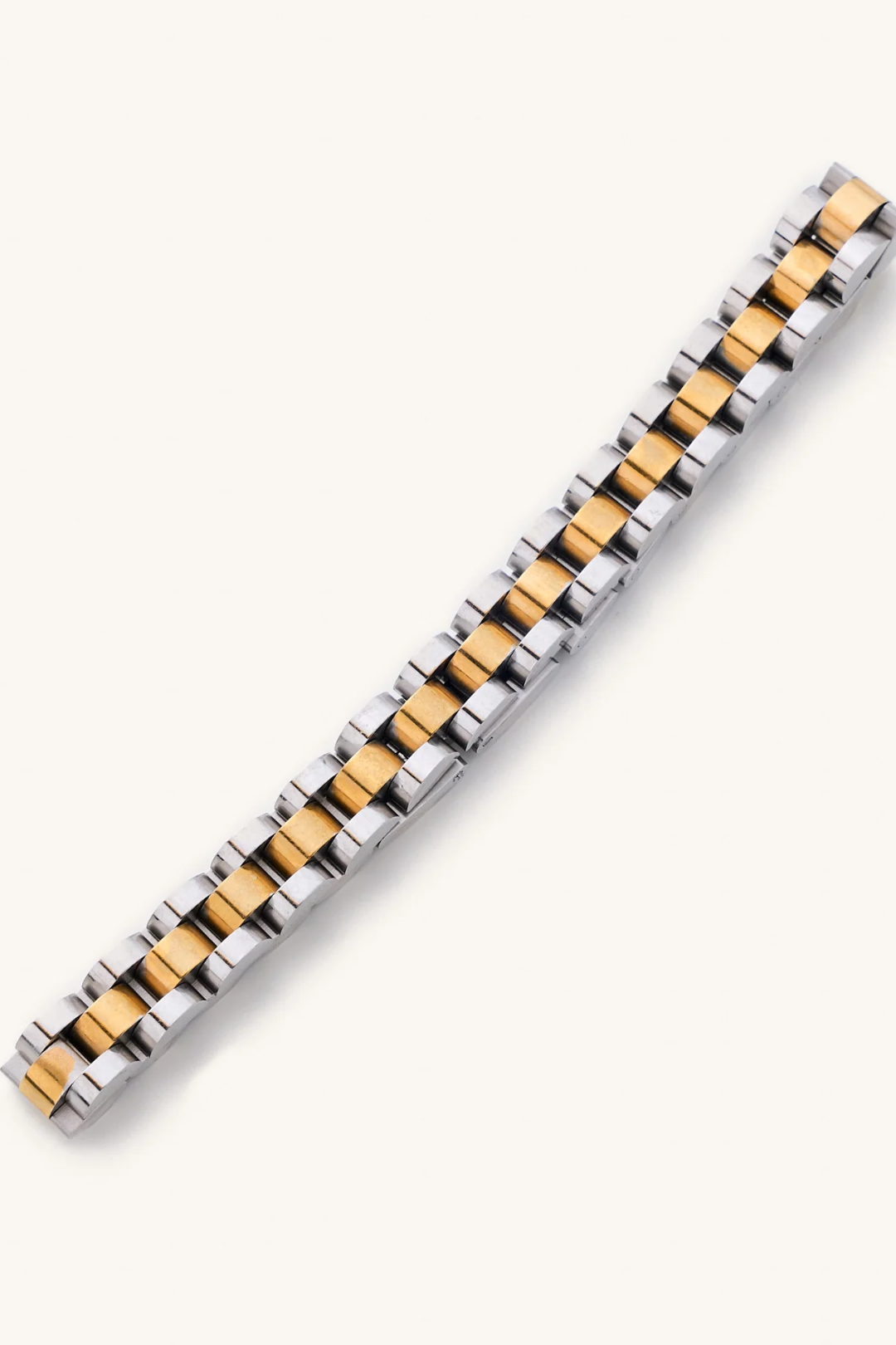 Elevate your evening ensemble by wearing this timeless Two Toned Watch Band Bracelet. This classy and chic accessory will make you feel confident at formal events or any occasion. A must-have addition to your jewelry collection!