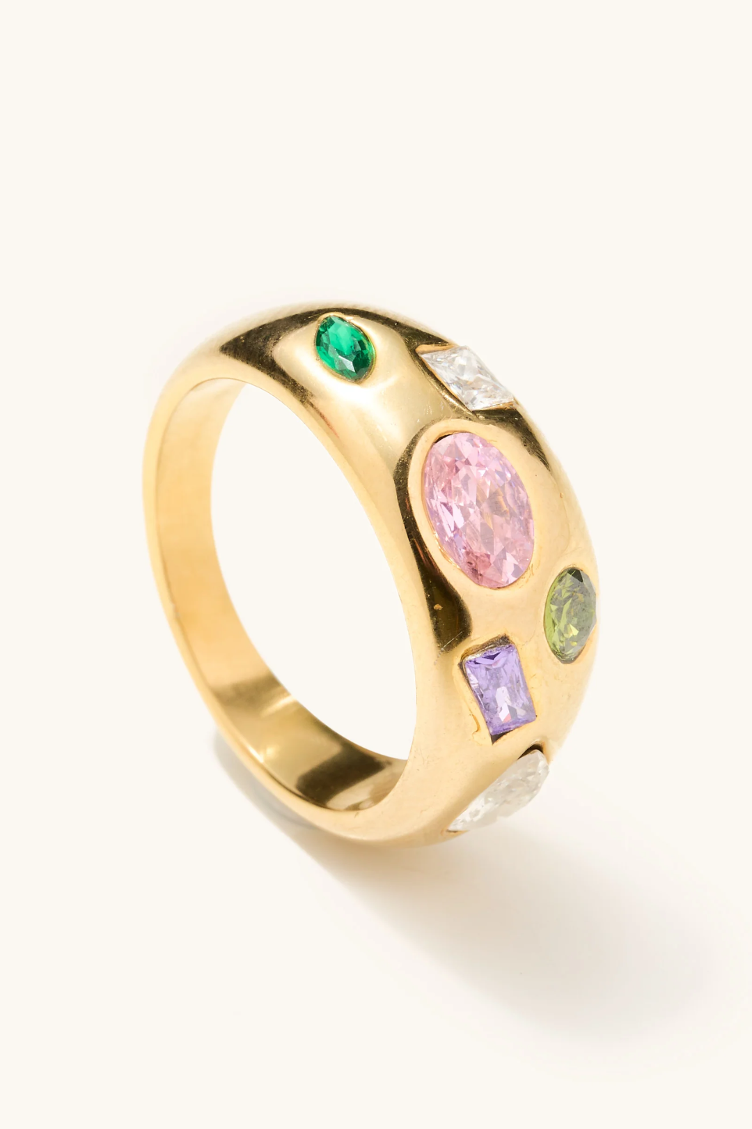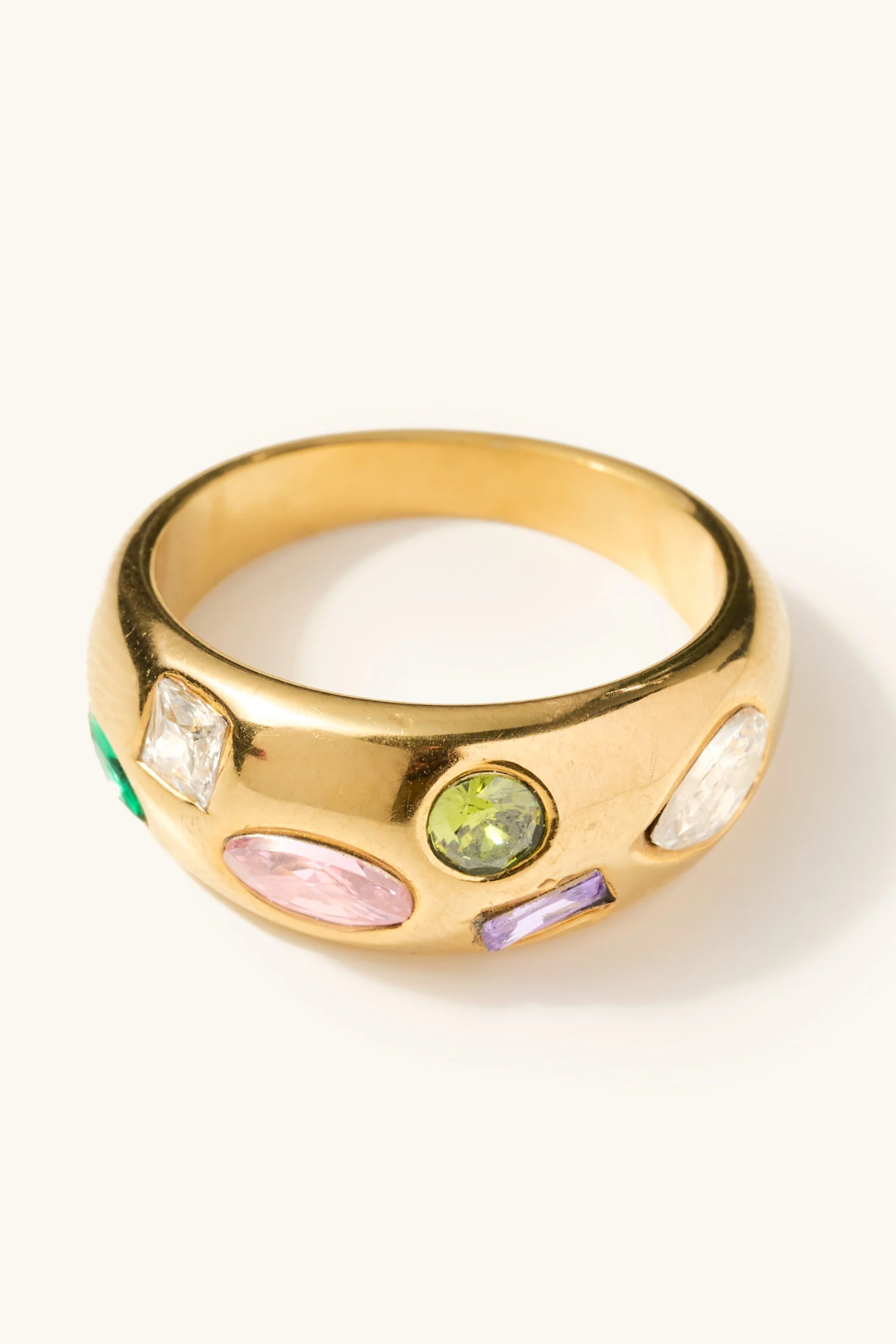 Bold, bright, and impossible to ignore! This Lizzy Multi Gem Chunky Ring adds a pop of color and sparkle to any look. Crafted from stainless steel and 14k gold, this statement ring features vibrant multicolor cubic zirconia gems. Waterproof and durable, it's designed to keep its shine no matter where life takes you.