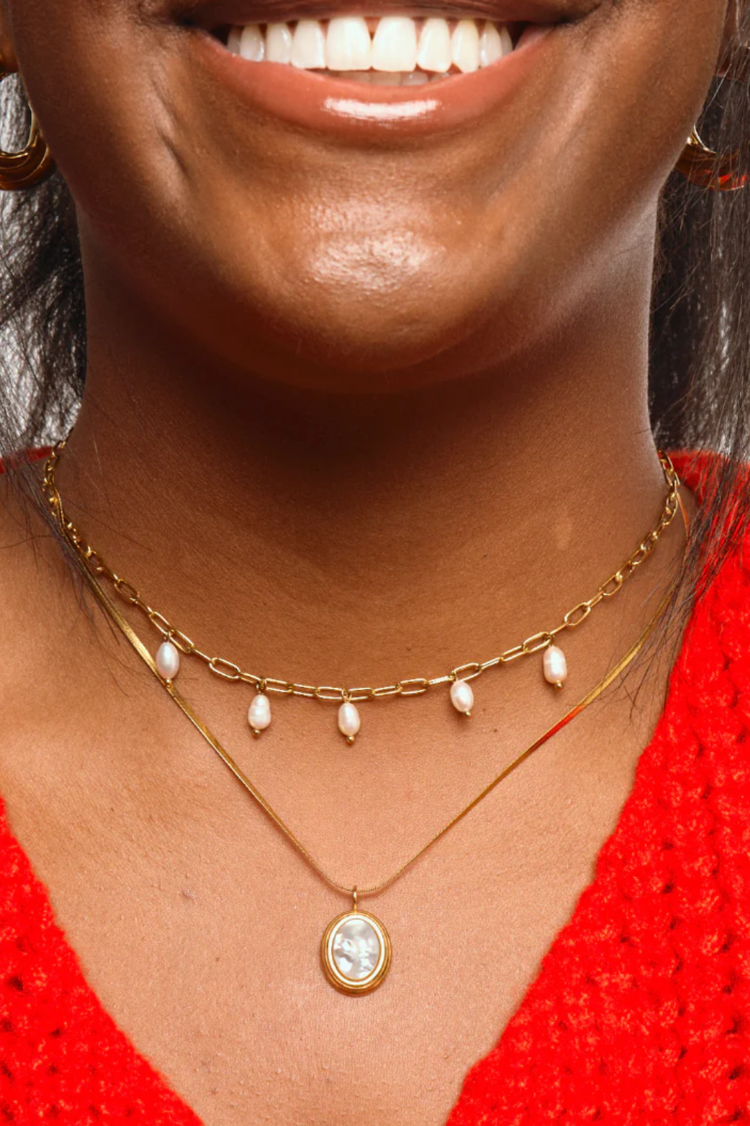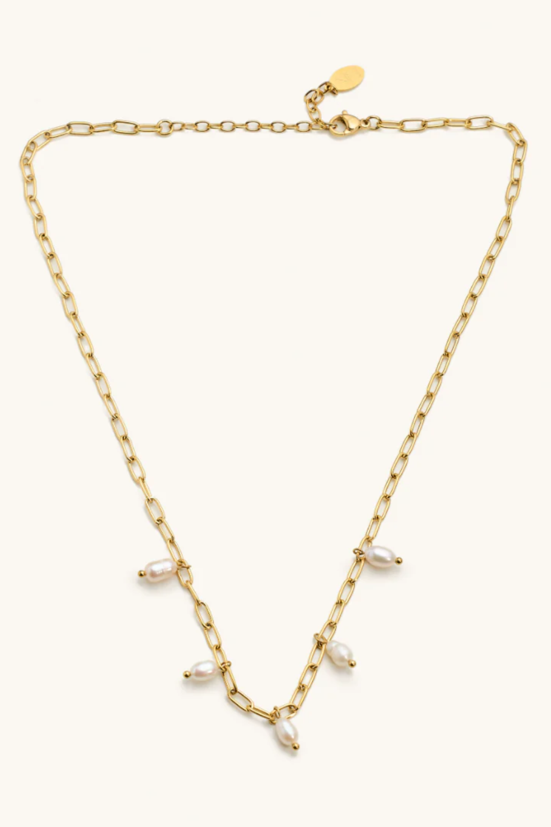 A classic with a twist. Pearl Charm Drop Necklace features lustrous freshwater pearls paired with a waterproof gold chain — delicate, timeless, and ready for everyday shine. Whether layered or worn solo, it adds a touch of elegance to any look.