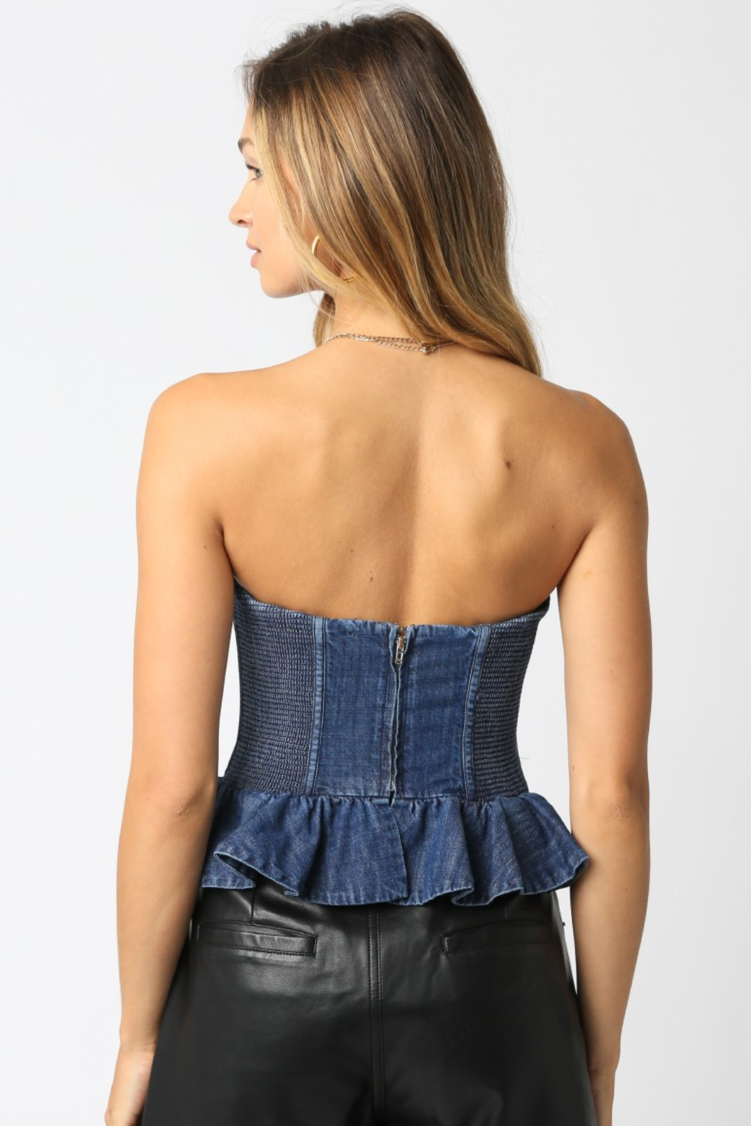 This Cindy Denim Top is a cool-girl staple with a playful edge. It's a strapless denim bustier with a sweetheart neckline that flatters and smocked sides for comfort and flexibility. The ruffled peplum hem adds a flirty, feminine touch, while the zipper closure at the back keeps it sleek and easy to wear. Perfect for going-out looks, brunch with friends, casual date nights, and music festivals.
