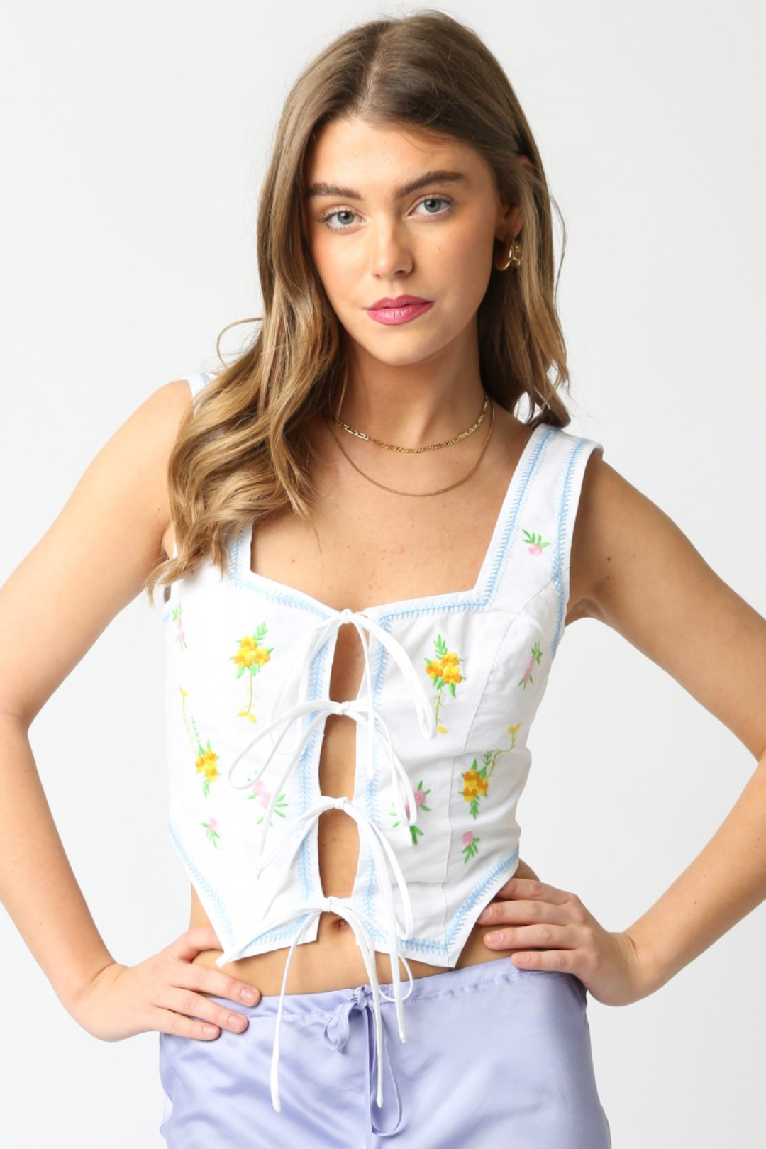 Light, airy, and effortlessly charming — the Embroidered Cotton Top brings coastal vibes wherever you go. Crafted from cotton in a crisp white and blue hue, this sleeveless, cropped beauty features delicate embroidery and a flirty front tie closure. Perfect for weekend brunches, festival looks, and all your sun-chasing plans.