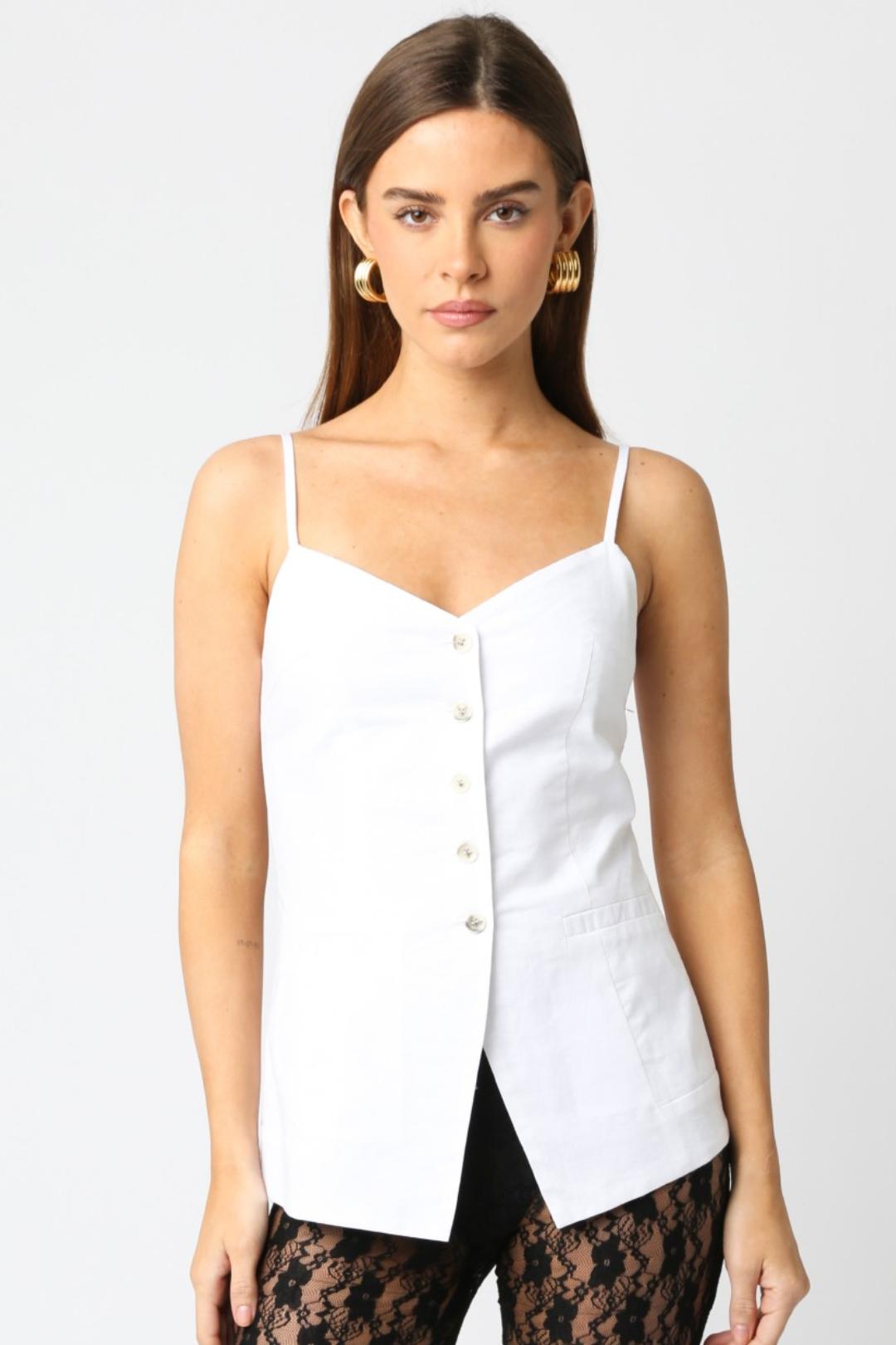 Light as linen, fresh as the view. This Hina Button Top is made for getaway days and golden hour moments. It's a sleeveless top with a button-down design and adjustable straps. Ideal for layering or wearing solo on sun-drenched days and balmy nights.