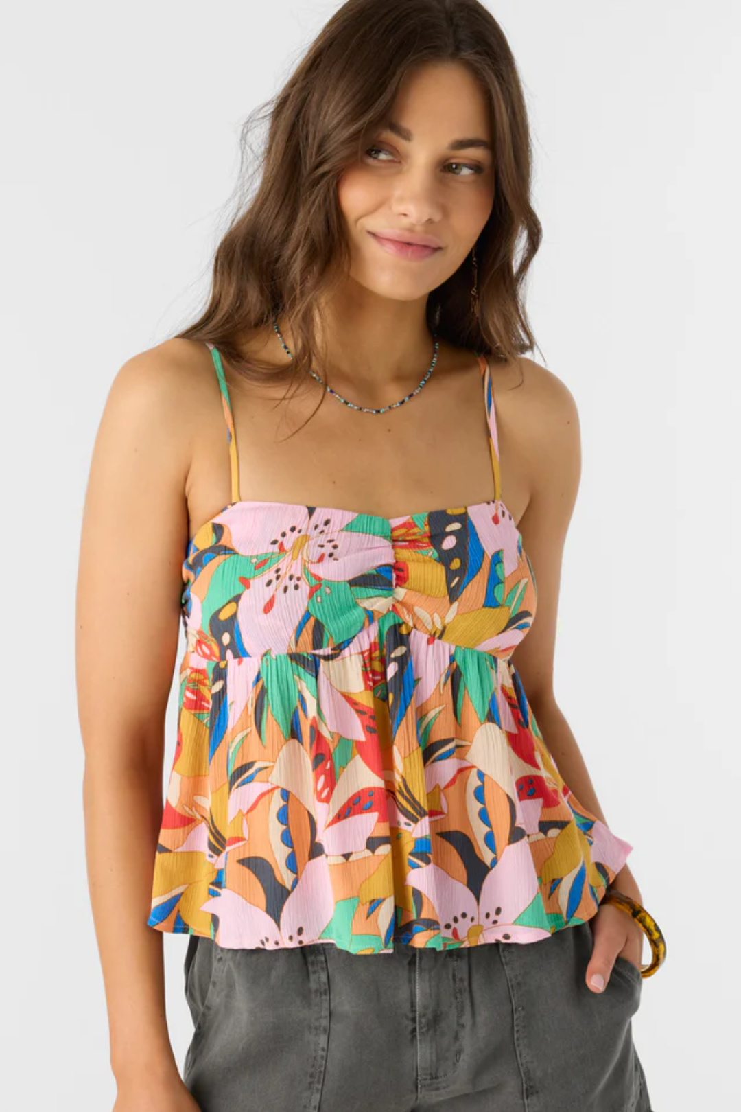 Bring the fun and the charm with O'Neill's Reeta Cabana Top. It's a lightweight woven fabric with an allover print, adjustable straps, and a regular-length fit. This top is perfect for casual sunny strolls or beachside brunches.