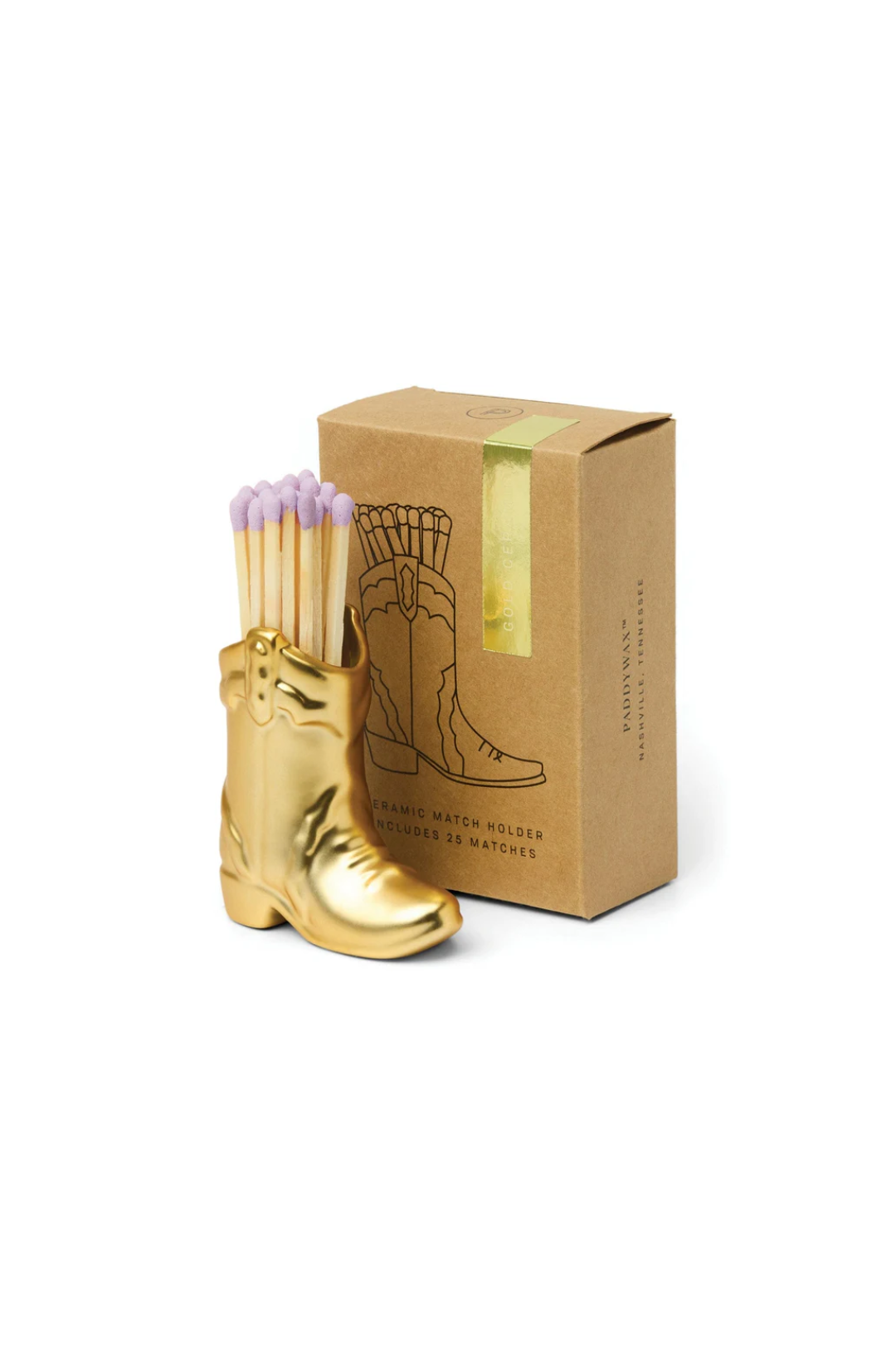 Light up your space with a little Western charm. This gold metallic cowboy boot is not just decor—it's a statement. Designed as a chic match holder with a built-in striker, it's the cutest way to spark candles, cozy nights, and all your yeehaw energy. Comes with colorful safety matches, so it's ready to gift straight out of the box. Saddle up your shelf styling!