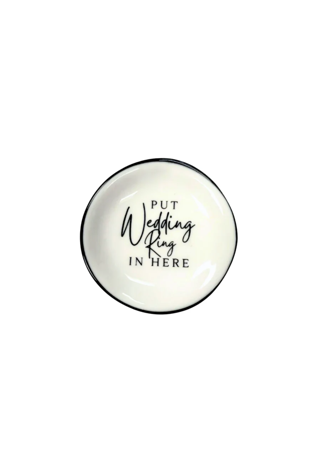 Never misplace your ring again in this Ring Dish - Put Wedding Ring in Here. This petite ring dish is the perfect spot to keep your wedding ring or daily jewelry safe and in sight. With the playful phrase " Put Wedding Ring in Here" printed in chic script, it's both functional and fun—perfect for your nightstand, sink side, or dresser.