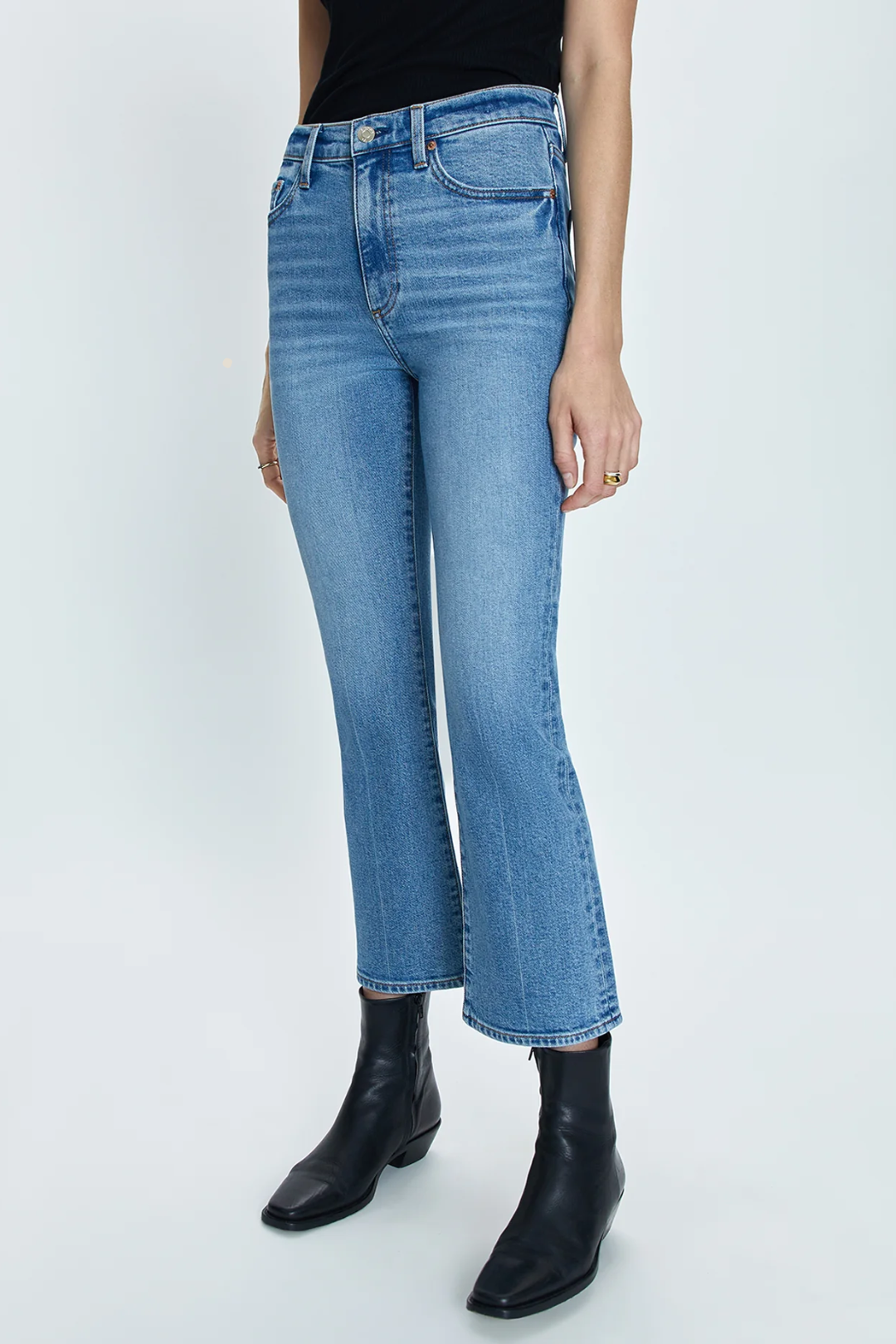 Let me introduce you to the Lennon Jeans in Derby by Pistola, a classic bottom that is well-liked by many. It is crafted from comfort-stretch denim with a bootcut silhouette, a medium blue denim wash with moderate fading and whiskering, and clean finishes. Perfect for running errands or going out for the day.