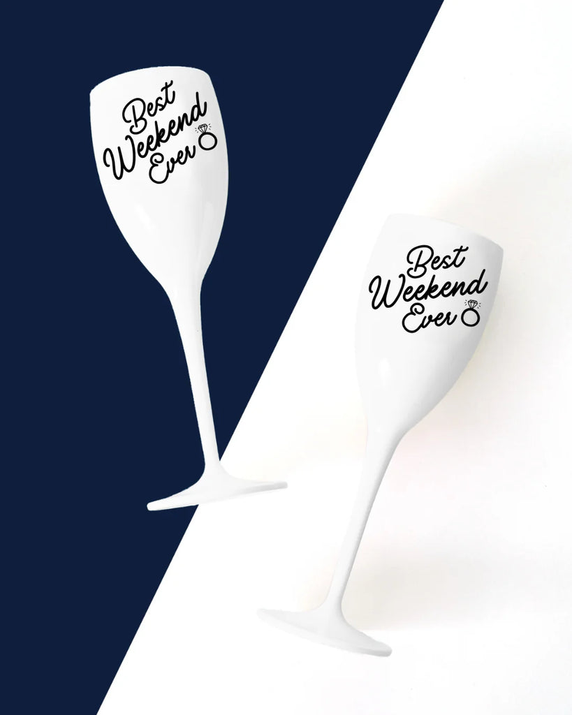 Make your weekend more fun and memorable with the Best Weekend Ever Champagne Flutes. These durable and lightweight flutes will add a chic and festive touch to any occasion. Perfect for cocktail parties, engagement events, weddings, or other special celebrations.