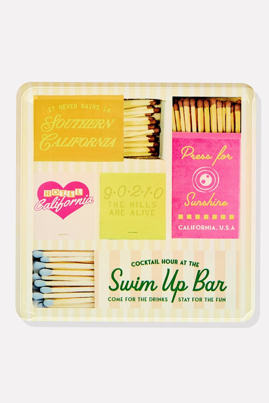 Bring a little West Coast charm to your table with this California Matchbook Coaster. It features a playful design on durable acrylic and protects your surfaces with a side of whimsy. Perfect for brightening up your bar cart or desk or gifting to your California-lovin' friend.