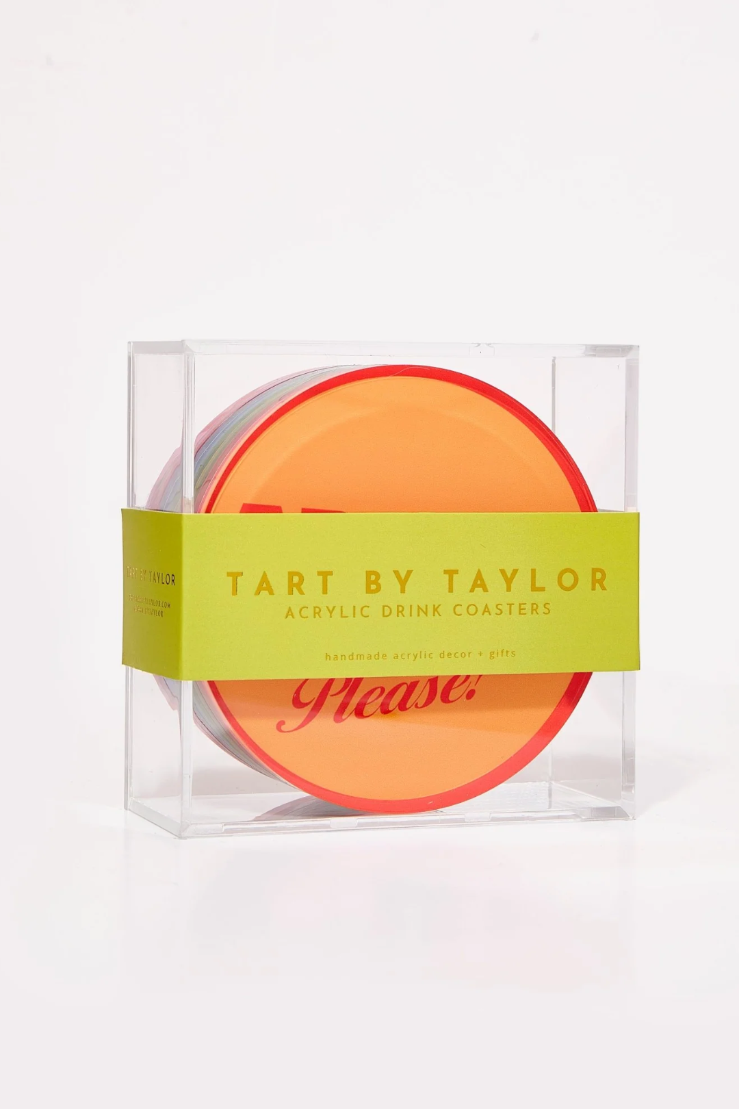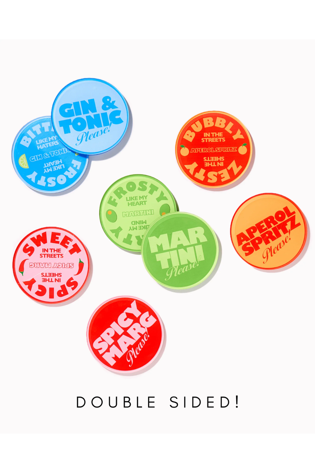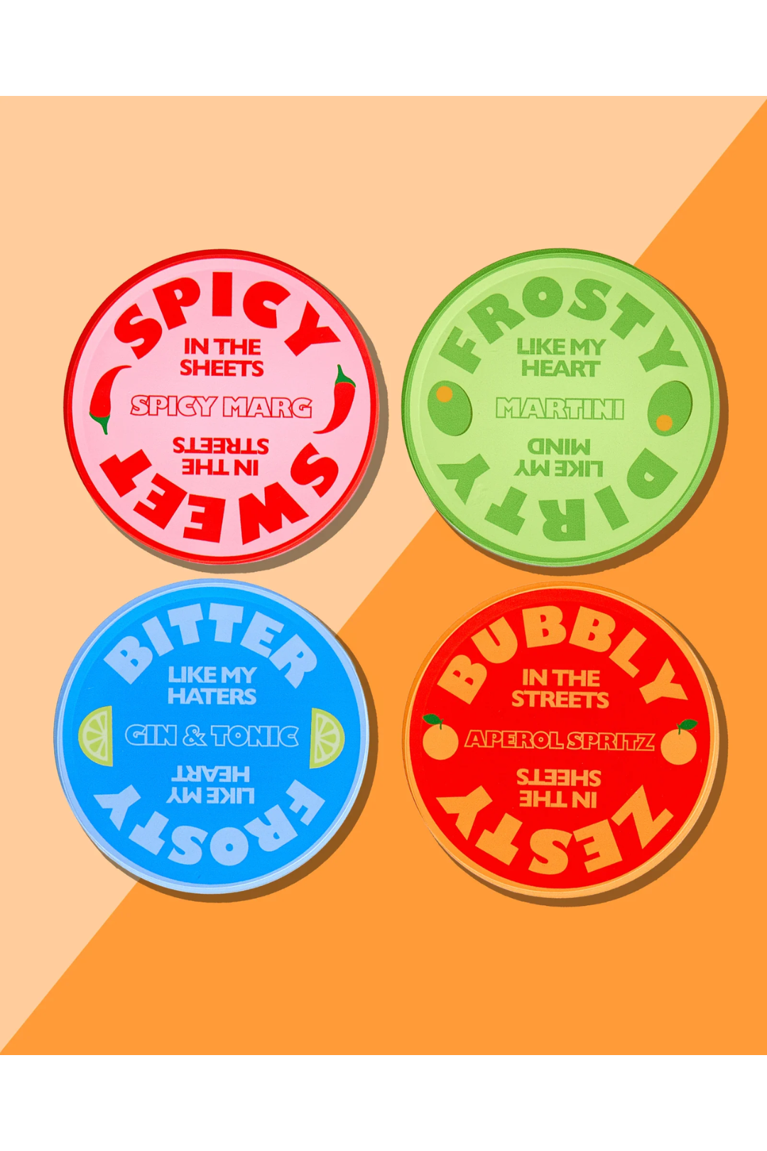Witty and ready for happy hour! The Drinks On Me Coaster Set is made from durable, clear acrylic and comes neatly packaged in a sleek display box with a coordinating band that is cute enough to gift, bold enough to keep. Each coaster delivers a witty one-liner on the front and back guaranteed to get the convo flowing faster than the cocktails.