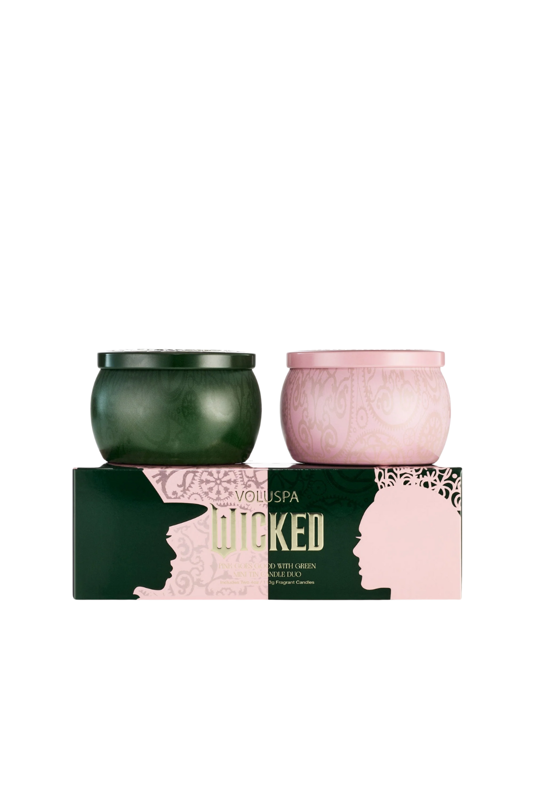 Uncover a scent story of two icons that perfectly balance dark allure and bright charm. It includes two mini tin candles: Elphaba's Bewitching Banyan Forest and Glinda's Perfectly Pink Yuzu. Together, they create a magical fragrance duet that's as enchanting as their story—opposites that truly attract. Perfect for gifting to your bestie, treating yourself to a cozy night in, or setting the scene for a witchy girls' night. This duo is made for those who love a touch of drama with their decor.