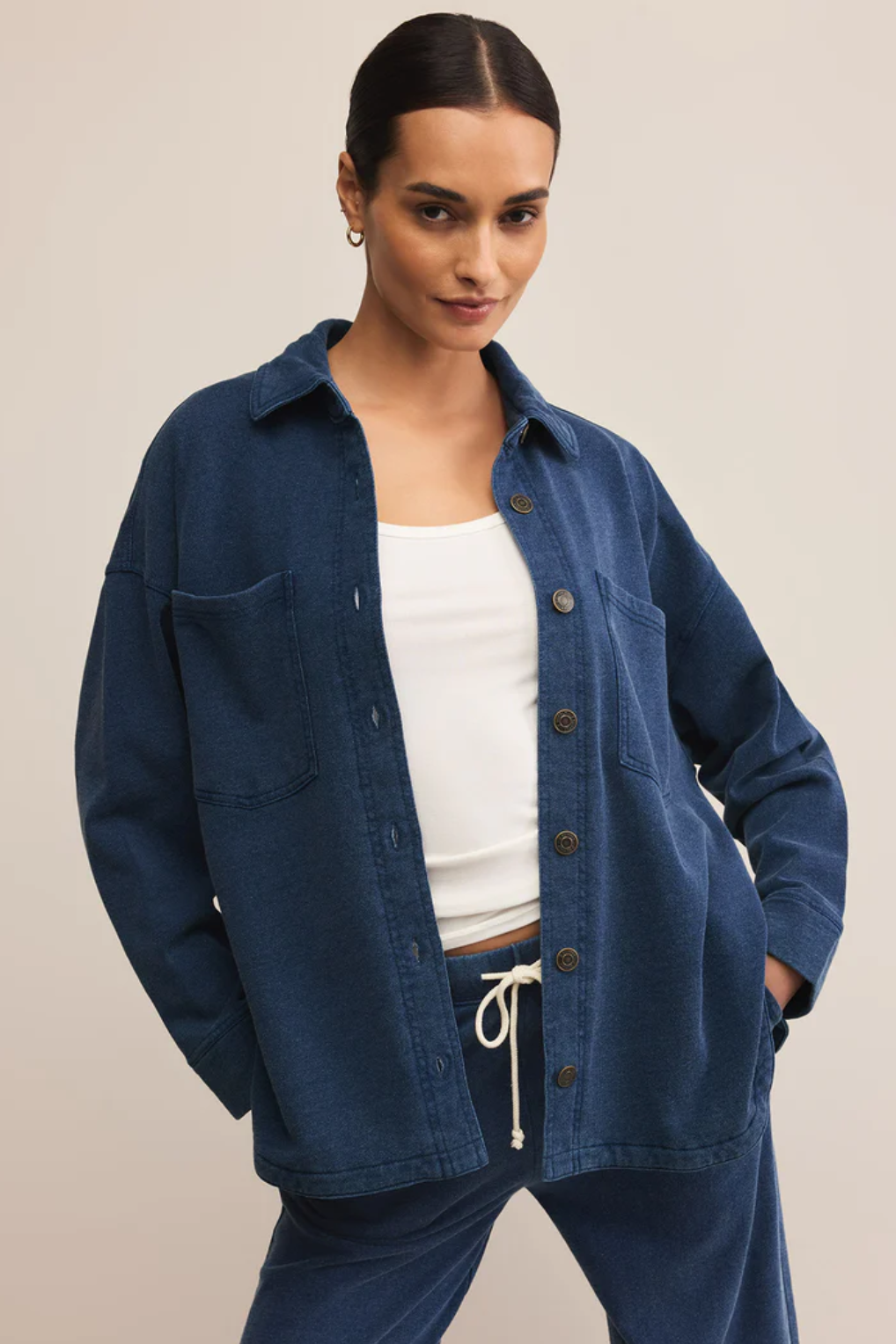 Throw it over a white tank and joggers for a laid-back airport fit, or pair it with a mini skirt and chunky sneakers for a street-style moment that screams off-duty cool.