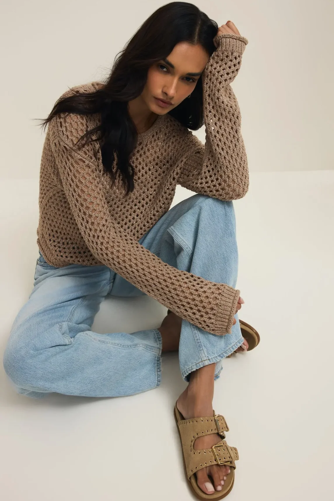 Glow different in this Cala Shimmer Crochet Sweater—soft, textured, and luxe in the prettiest warm campfire tone. This lightweight crochet knit brings that effortless cool energy with a subtle shimmer woven through. The open-knit design adds texture and depth, while the relaxed fit and classic crew neckline keep it easy and wearable. It's breathable, slightly slouchy, and gives that perfectly undone but still elevated vibe. Perfect for fall coffee runs, cozy date nights, weekend markets, casual office days, and layered winter looks.