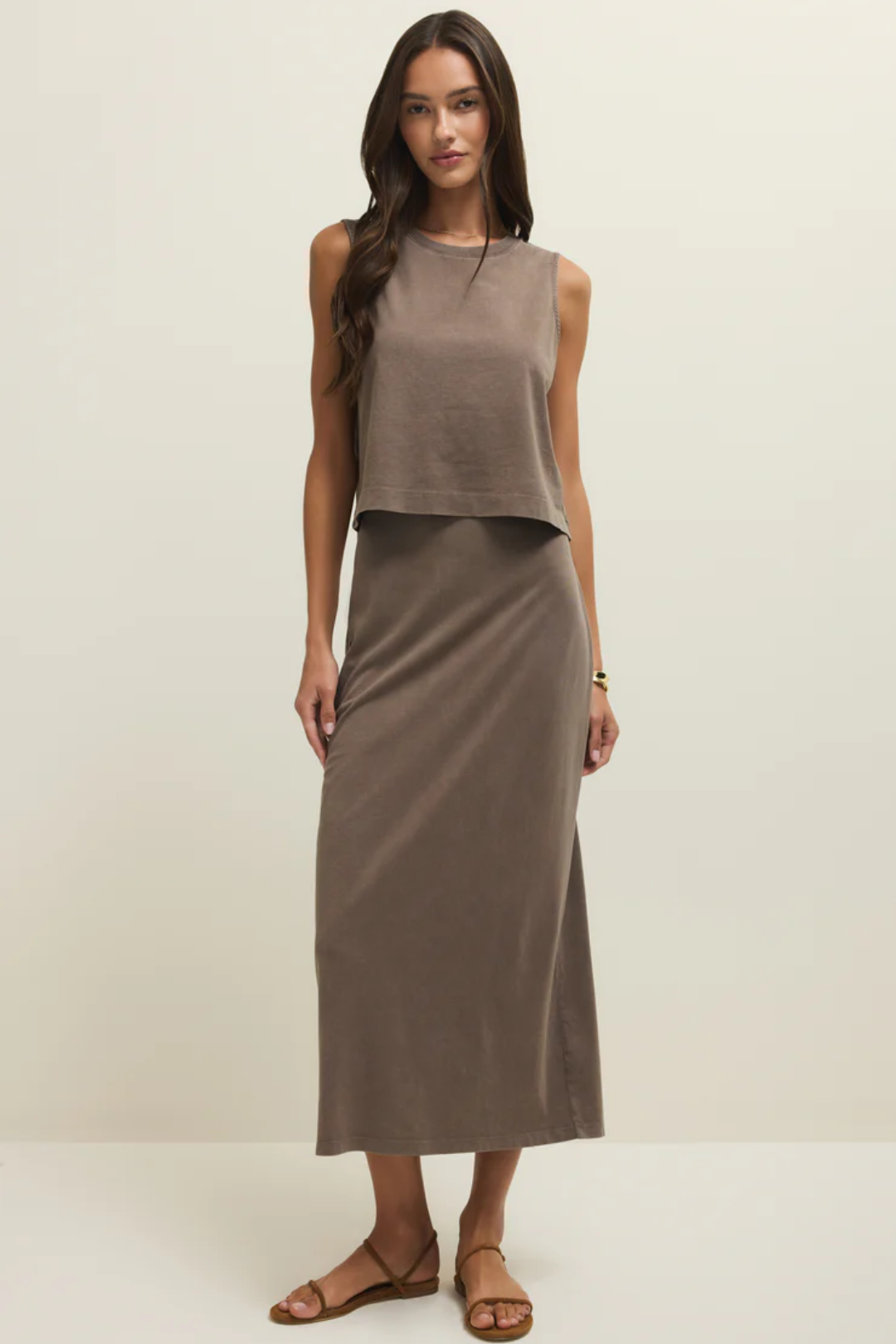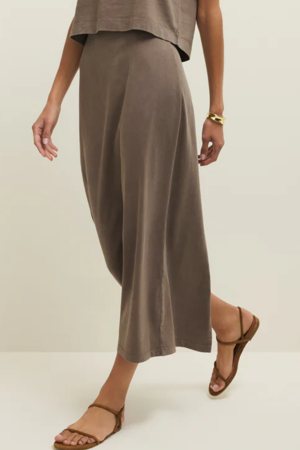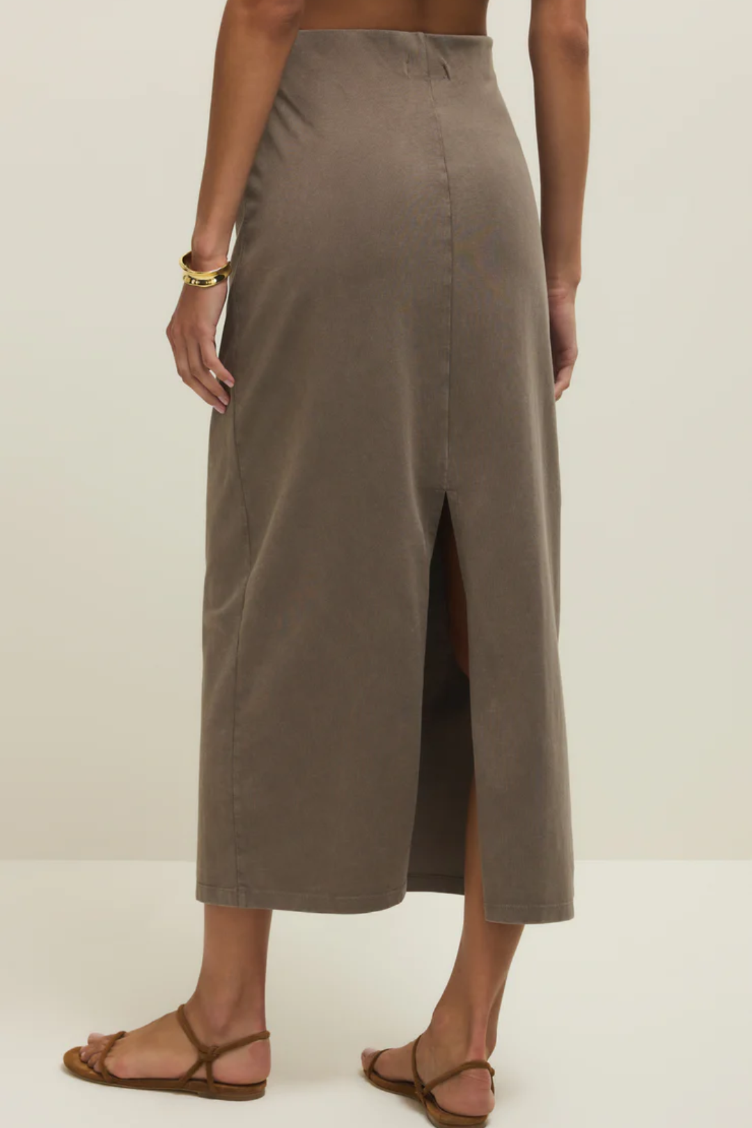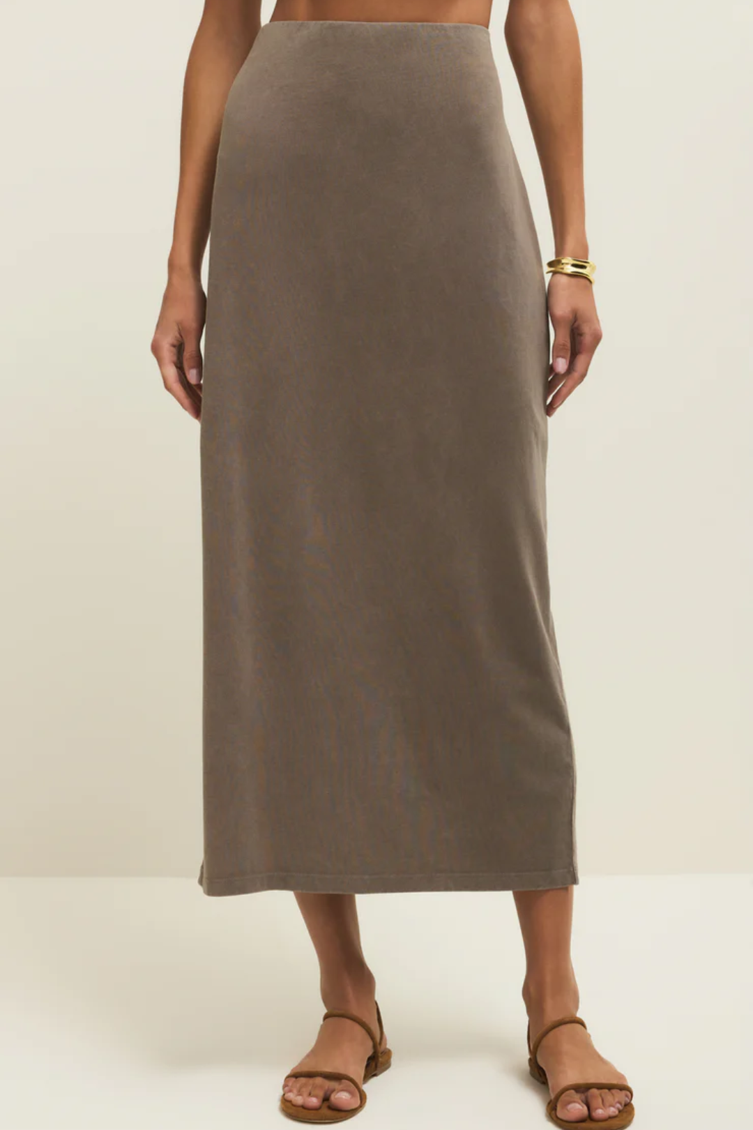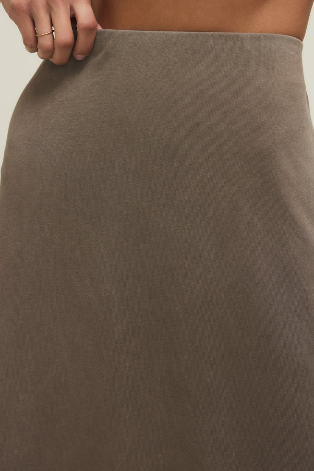 The Gail Midi Skirt in the dreamiest taupe shade is your new wear-on-repeat essential. Designed with a flattering mid-rise fit and a soft elastic waistband, it hugs smoothly at the waist and falls into a sleek, body-skimming silhouette. Crafted from breathable cotton jersey fabric, it feels insanely comfortable. Minimal and clean, this is the kind of piece that makes styling easy. Perfect for everyday outfits, coffee dates, casual office looks, travel days, or weekend plans.